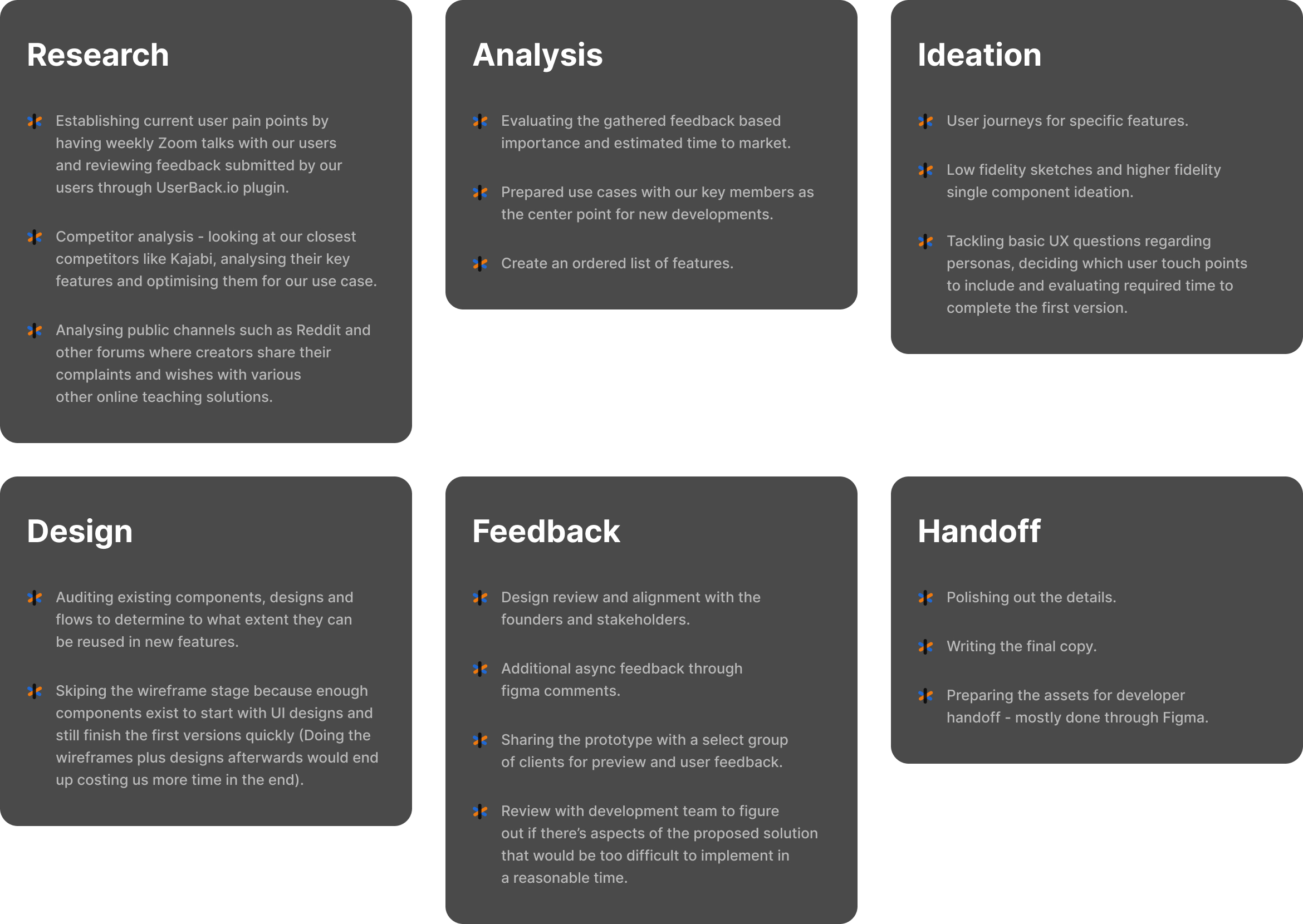 During the design process, especially when developing more complex features, I created user flow diagrams. This helped us identify edge cases and dead ends where the user might end up and eliminate them early in the process.