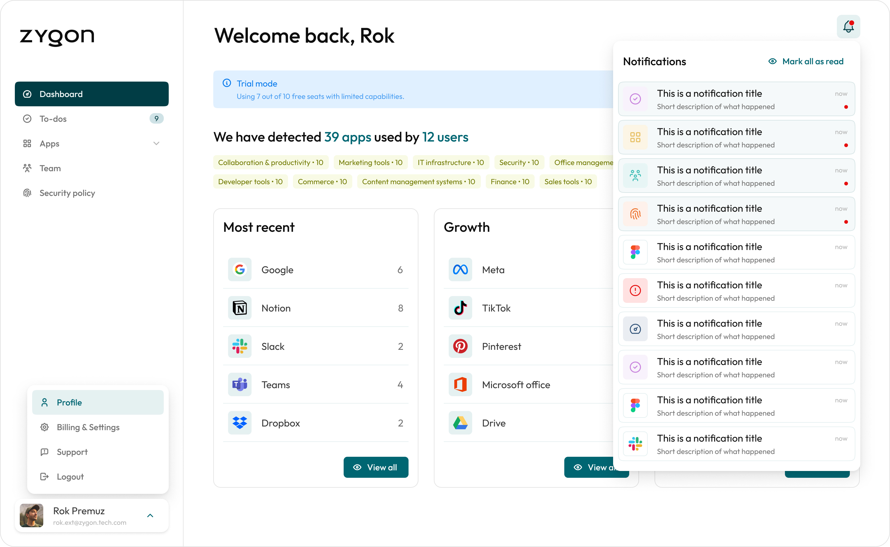 About → Zygon allows you to have automated control of all the SaaS applications used by your team. From app inventory to upgrading your authentication methods, our automations give you a much needed relief in controlling SaaS sprawl.
